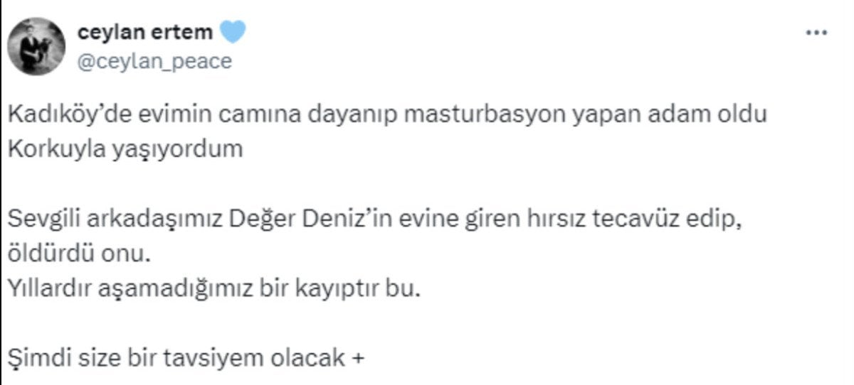 Ertem, açıklamasında, "Kadıköy’de evimin camına dayanıp mastürbasyon yapan adam oldu. Korkuyla yaşıyordum.