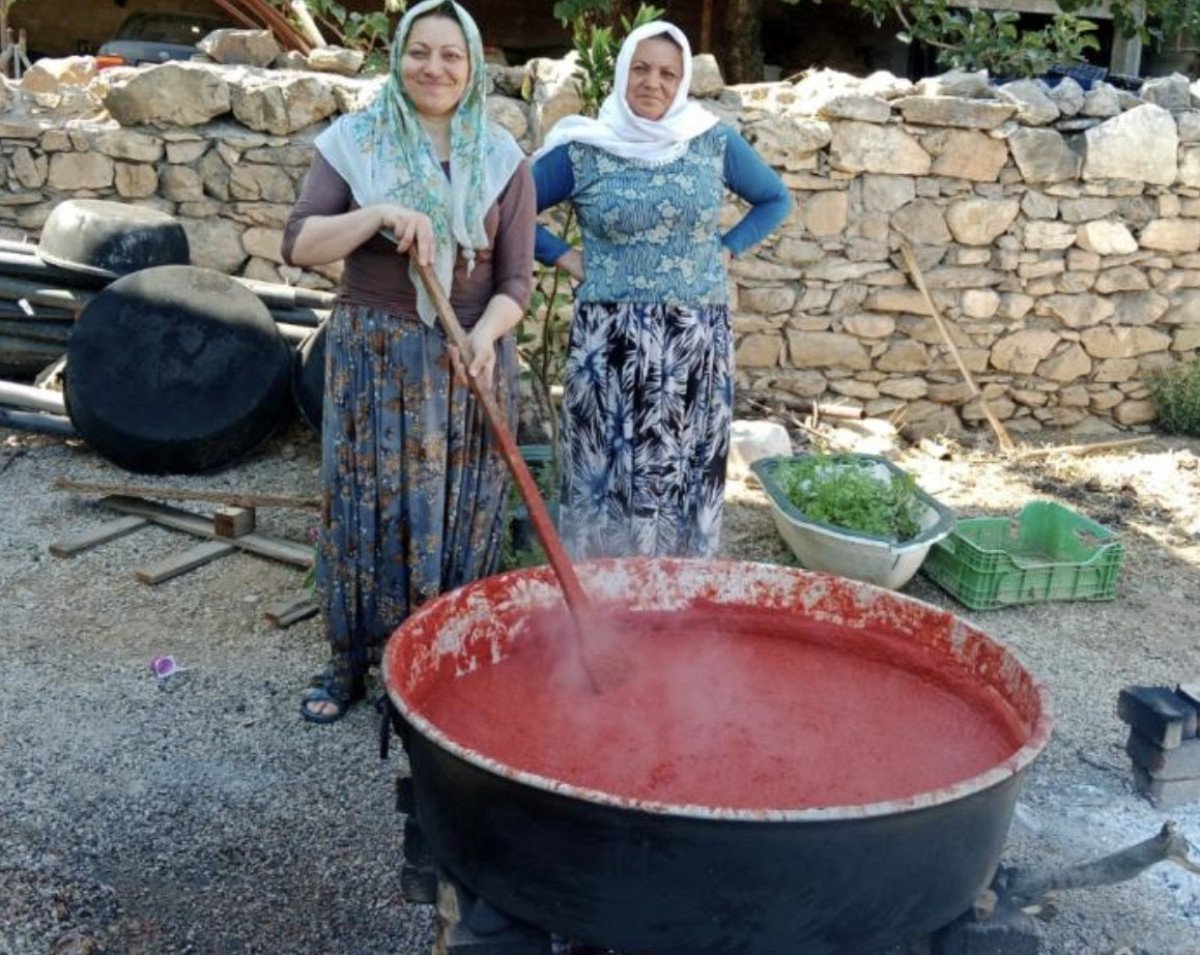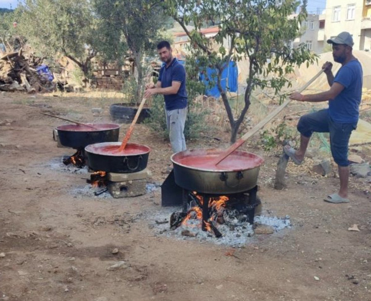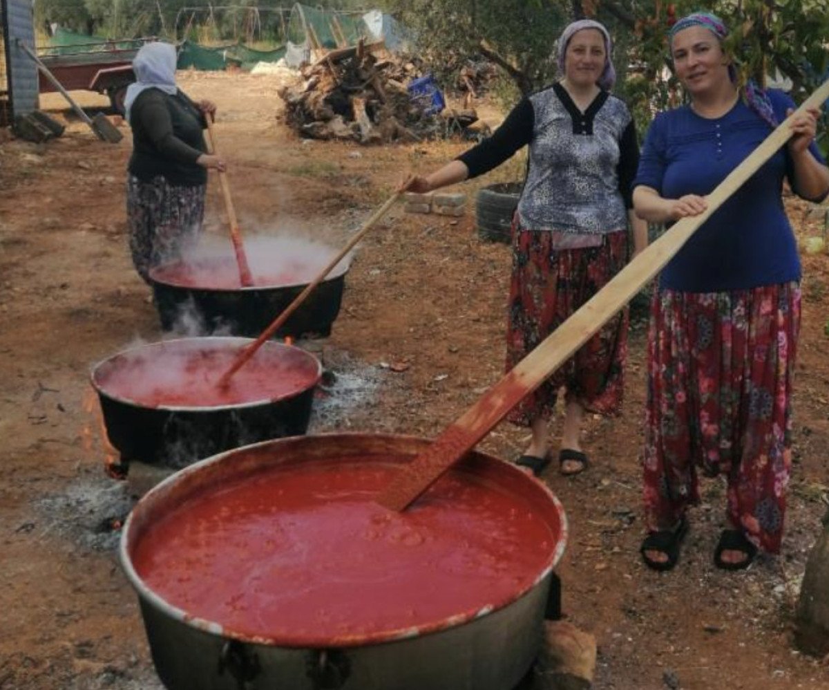 Kadınlar, sıra sıra koydukları kazanlarda odun ateşinin üzerinde kaynattıkları domateslerle kışlık salça yapmaya başladı.