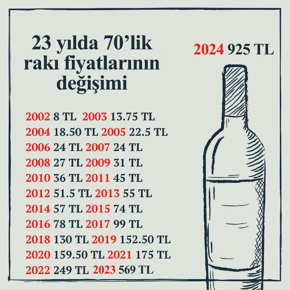 AKP’nin iktidara geldiği 2003 yılında 8 lira olan 70’lik rakı şuanda marketlerde 925 liraya satılıyor. AKP döneminde rakı fiyatları yüzde 11 bin 462 arttı. Son 1 yılda rakı fiyatlarındaki artış ise yüzde 62,56 seviyesinde.