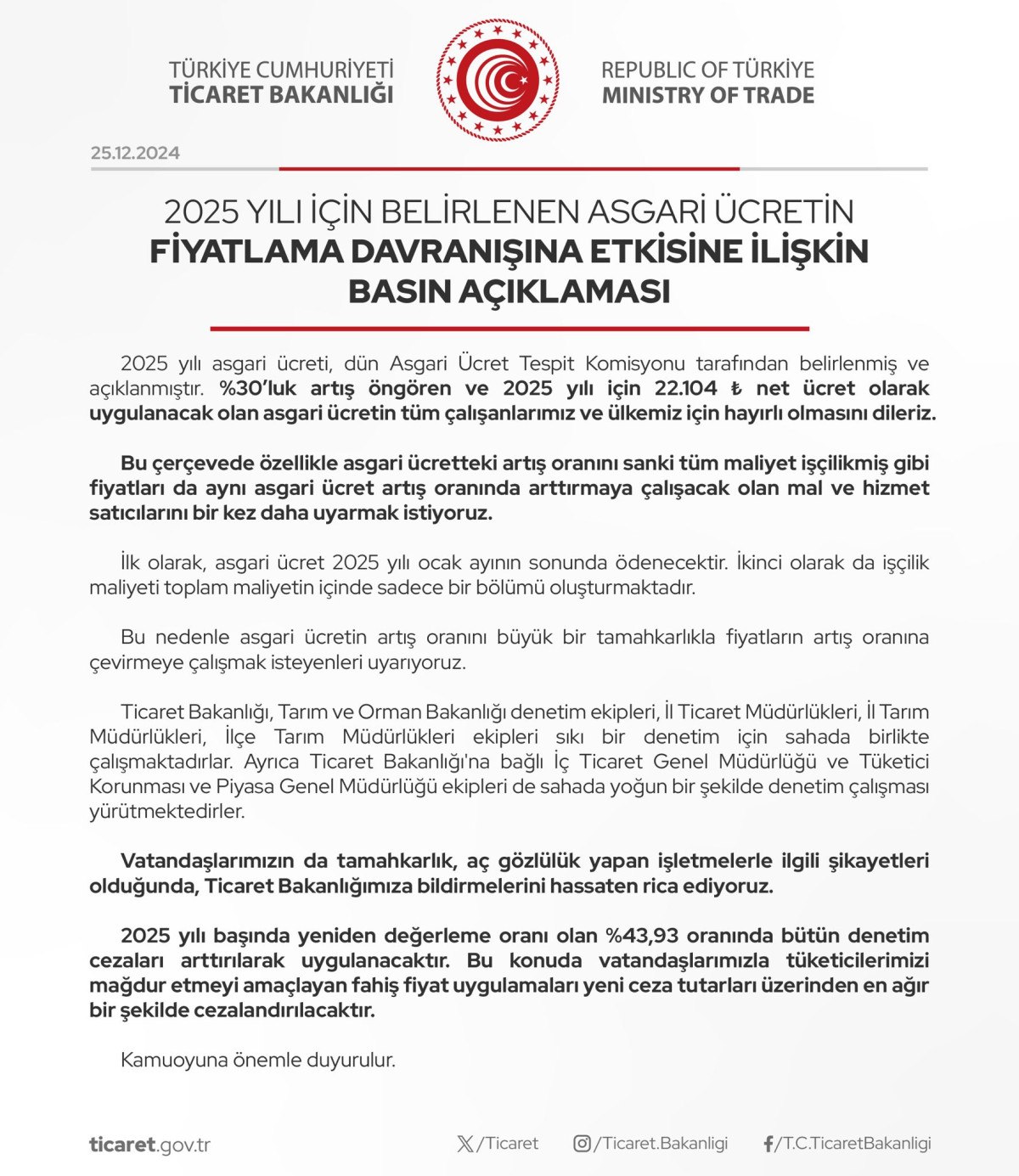 Ticaret Bakanlığı, asgari ücretin fiyatlama davranışına etkisine ilişkin açıklama yaparak, asgari ücrete yapılan artışı fırsat bilerek fiyat yükseltenleri 2025'de yüzde 43,93 oranında artırılmış cezalar beklediğini hatırlatarak şöyle uyardı: