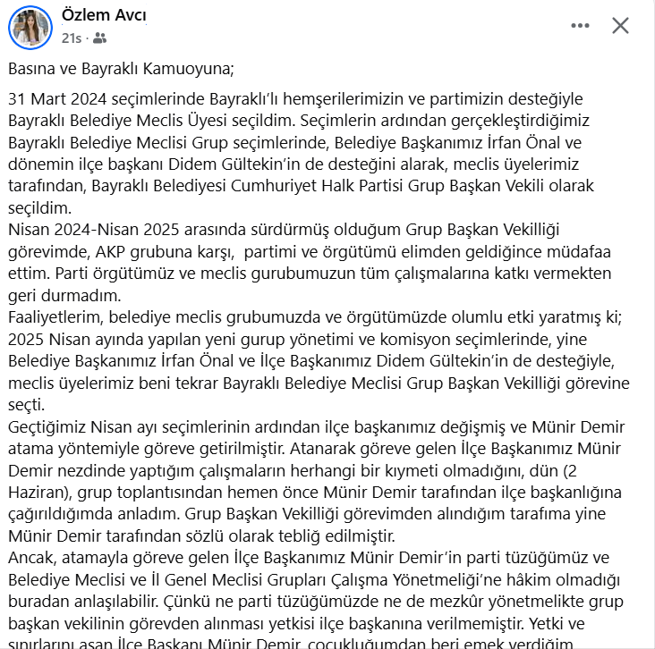 Bayraklı Belediyesi Cumhuriyet Halk Partisi Grup Başkan Vekili Özlem Avcı, yeni ilçe başkanı Münir Demir tarafından hukuksuz şekilde görevden alındığını açıkladı.