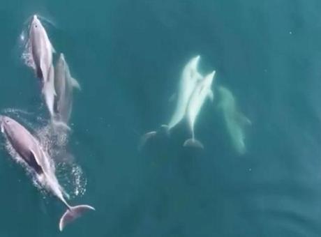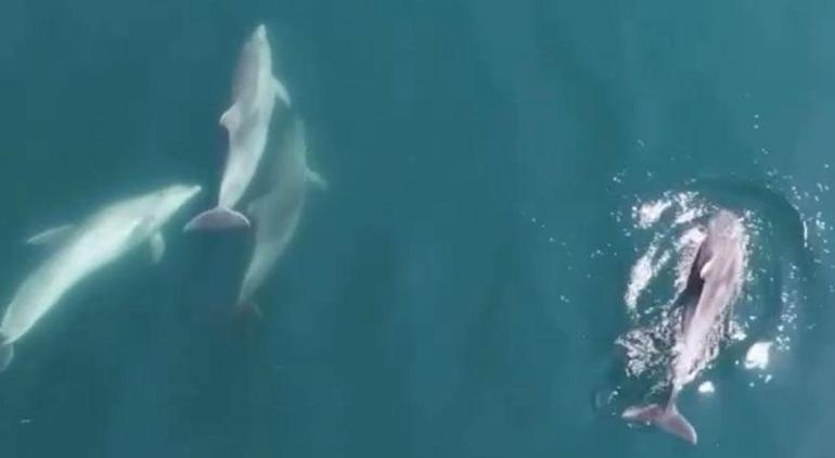 Suyun içinde adeta dans ederek yüzen yunuslar, çevredekiler tarafından cep telefonu ile kaydedildi.