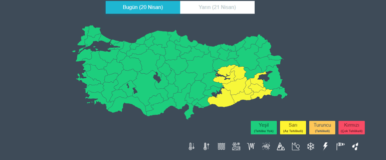 Yağışların; Doğu Anadolu’nun güneydoğusu, Güneydoğu Anadolu’nun güney ve doğusu ile Elazığ, Tunceli, Bingöl, Hatay, Osmaniye, Kilis ve Adıyaman çevrelerinde yerel kuvvetli olması bekleniyor. Sabah ve gece saatlerinde Marmara'nın doğusu ile Batı Karadeniz'de pus ve yer yer sis hadisesi tahmin ediliyor. Doğu Karadeniz'in iç kesimleri ile Doğu Anadolu'da yüksek kar örtüsüne sahip eğimli alanlarda çığ ve kar erimesi tehlikesi bulunuyor.