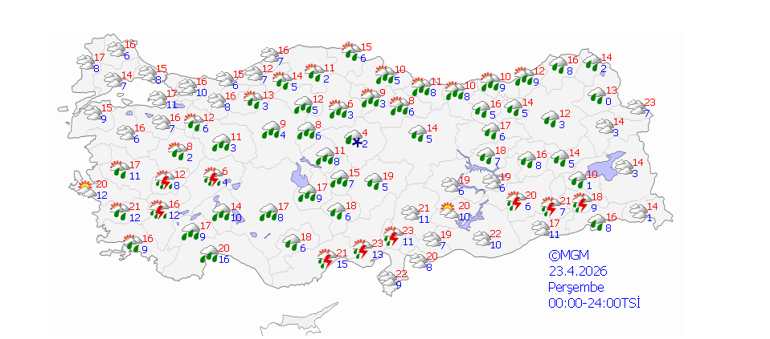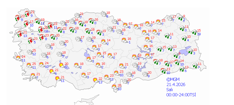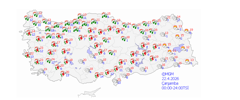 Yurt genelinin parçalı ve çok bulutlu, Doğu Akdeniz'in kuzey ve doğusu, Doğu Karadeniz, Doğu ve Güneydoğu Anadolu ile Ordu çevrelerinin aralıklı yağmur ve sağanak; Doğu Akdeniz ile Güneydoğu Anadolu sağanak ve gök gürültülü sağanak yağışlı, Doğu Karadeniz’in iç kesimlerinin yüksekleri ile Doğu Anadolu’nun kuzeydoğusunun yüksek kesimlerinin karla karışık yağmur ve kar yağışlı geçeceği tahmin ediliyor.