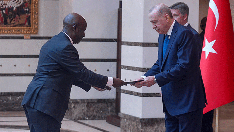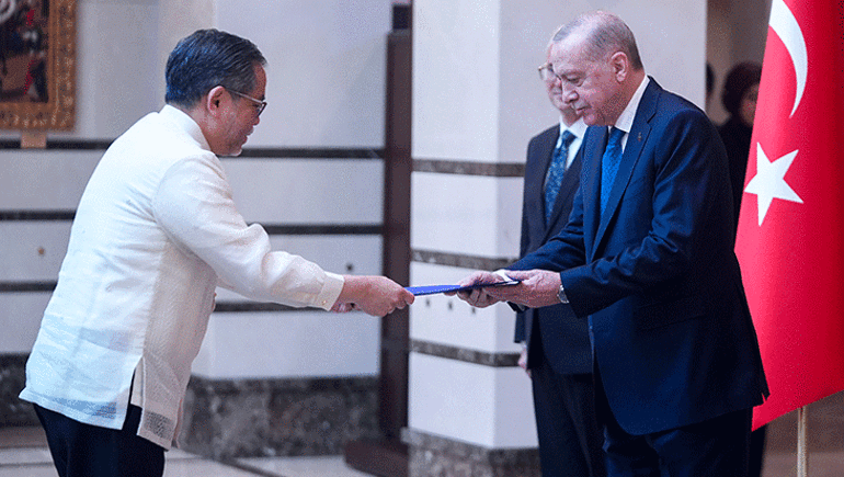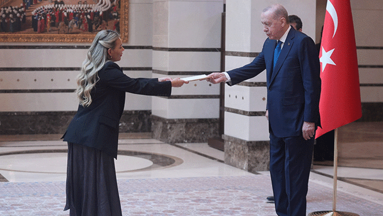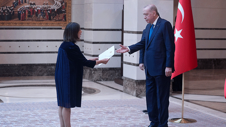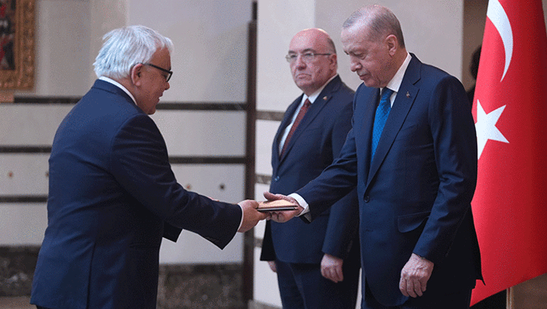 Cumhurbaşkanlığı Külliyesi'ndeki kabulde, Filipinler Büyükelçisi Jamie Ramon Torre Ascalon JR, Kenya Büyükelçisi Anthony Mwaniki Muchiri, Kolombiya Büyükelçisi Yenniffer Edilma Parra Moscoso, Peru Büyükelçisi Luz Betty Caballero Morales ve Rusya Büyükelçisi Sergey Vasilievich Vershinin, Cumhurbaşkanı Erdoğan'a güven mektuplarını sundu.
